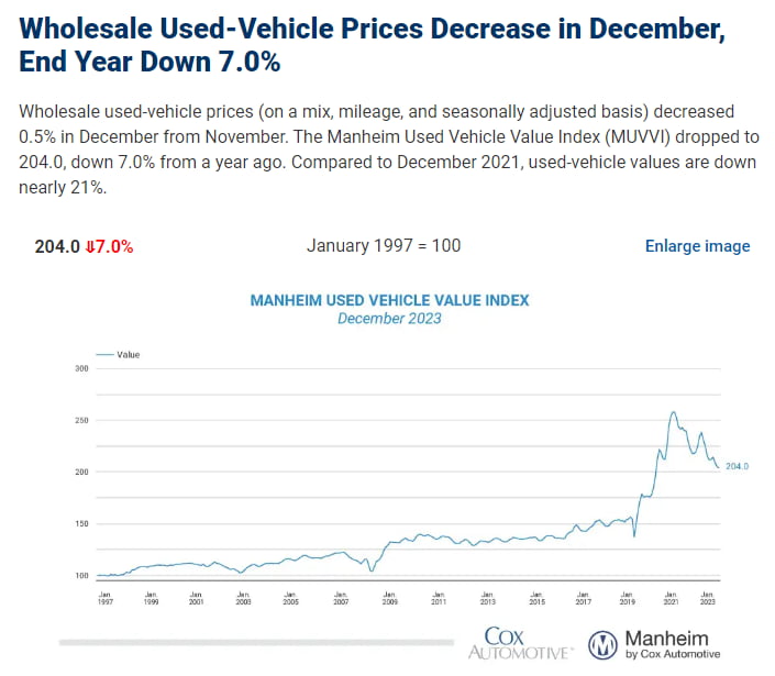 게다가 오늘 아침 9시 12월 만하임 중고차 지수가 발표됐는데, 한 달 만에 0.5% 추가 하락해 전년 동기보다 7% 내린 것으로 나타났습니다. 2년 전인 2021년 12월에 비하면 거의 21% 하락한 것입니다.