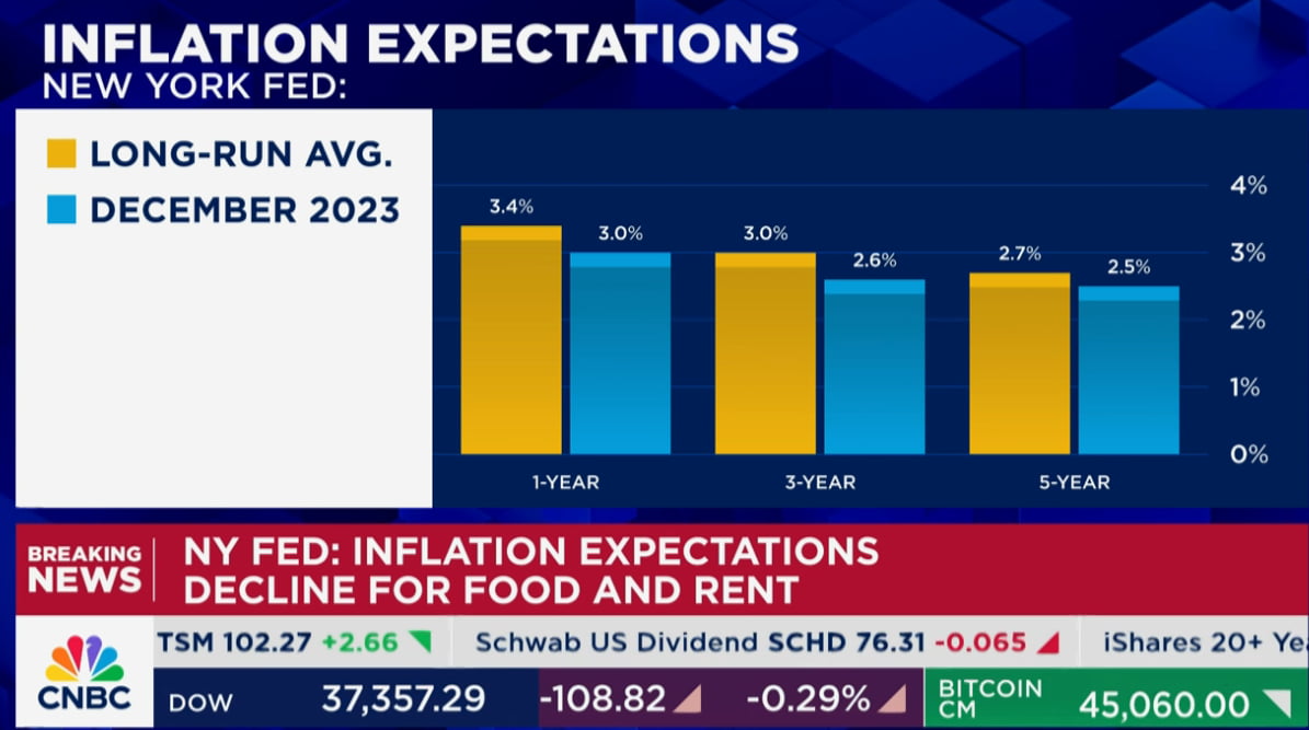 오전 11시 뉴욕 연은이 발표한 12월 소비자 인플레이션 기대치는 팬데믹이 터진 뒤 3년 만에 최저치로 떨어졌습니다. 1년 기대치는 한 달 전 3.4%에서 3%로 떨어졌고, 3년 전망은 3%에서 2.6%로 낮아졌습니다. 또 5년 전망은 2.7%에서 2.5%로 내려갔습니다. 소비자들의 식품 및 임대료에 대한 기대치도 떨어졌습니다.