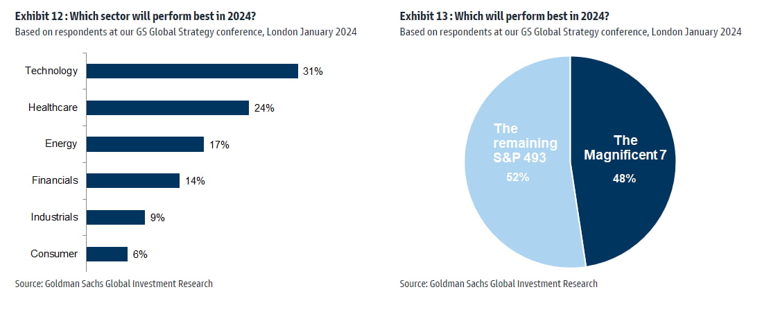 주식 중에서는 31%가 테크를 가장 좋을 것 같은 업종으로 지목했고요. 헬스케어 24%, 에너지 17%, 금융 14% 순이었습니다. 특히 S&P500 종목 중 M7 종목과 나머지 493개 종목 사이에선 493개 종목이 나을 것으로 보는 사람이 52%, M7이 나을 것이란 답이 48%로 우열을 가리기 힘들었습니다.