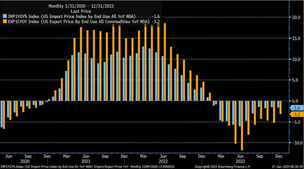 12월 수입 가격은 전달과 같은 0%로 예상 0.1% 상승보다 낮게 나왔습니다. 수출 가격은 0.9% 하락해 예상 0.7% 하락보다 더 낮았고요.