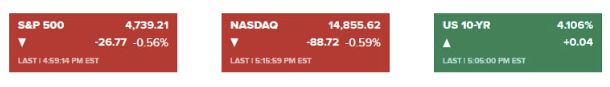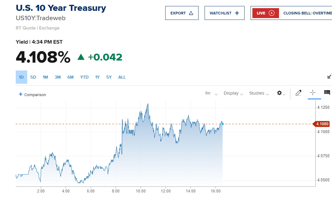 미 국채 2년물 수익률은 소매판매 발표 직후 14bp가량 뛰어올랐습니다. 유럽에서의 매파적 발언, 강력한 경제 데이터 탓입니다. 10년물 수익률도 4.10%대로 올라섰고요.