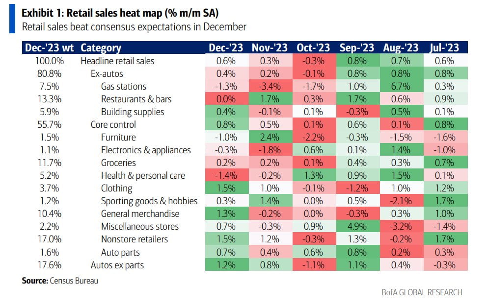 13개 카테고리 중 9개에서 증가세가 나타났습니다. 자동차 판매는 전월 대비 1.1%, 의류는 1.5%, 백화점은 3% 늘었습니다. 소비가 줄어든 4개 카테고리 중 3개(의료용품, 가구, 전자제품)는 지난 12월 물가가 하락한 부문이었고, 나머지 하나는 휘발유입니다.