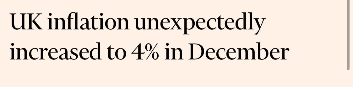 밤새 영국의 12월 소비자물가(CPI)는 11월 3.9%에서 4.0%로 반등했습니다. 또 월간 상승률은 11월 -0.2%에서 12월 0.4%로 치솟았습니다. 12월 물가 반등은 전 세계 공통 현상입니다. 유로존의 12월 CPI는 2.9% 오른 것으로 최종 집계되어 예비치 그대로 확정됐습니다. 이는 11월 2.4%보다 크게 오른 것이죠. 어제 캐나다에서도 CPI가 12월 3.4%로 11월 3.1%에서 상승했었고, 지난주 미국의 12월 CPI도 마찬가지로 11월 3.1%에서 3.4%로 높아졌었지요.