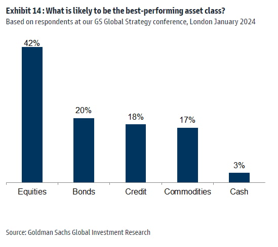 올해 가장 수익률이 높을 것 같은 자산으로는 42%가 주식을 선택했고요. 채권이 20%, 회사채가 18%, 원자재가 17%의 표를 받았습니다. 현금은 3%에 그쳤습니다.