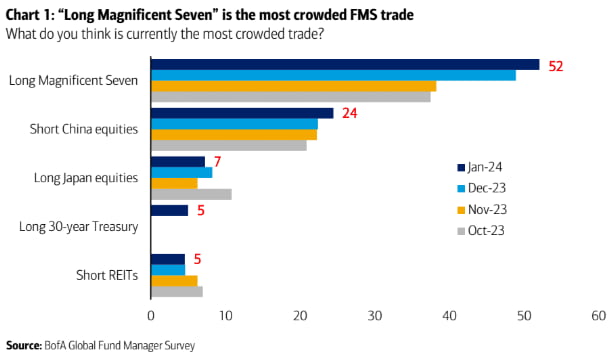 다만 투자자 조사를 보면 여전히 M7에 대한 시각은 엇갈립니다. 뱅크오브아메리카의 1월 글로벌 펀드매니저 조사에서는 여전히 가장 활발한 거래로 52%가 'M7' 매수를 꼽았습니다.
