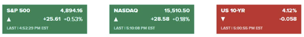 뉴욕 증시의 주요 지수는 '열반'급 데이터에 0.3% 안팎의 상승세로 출발했습니다. S&P500 지수는 4898까지 오르며 몇 차례나 4900 돌파를 시도했습니다. 결국, S&P500 지수는 0.53% 올라 4894.16으로 마감했습니다. 다우는 0.64% 올랐고, 나스닥은 0.18% 상승한 채 거래를 마쳤습니다.