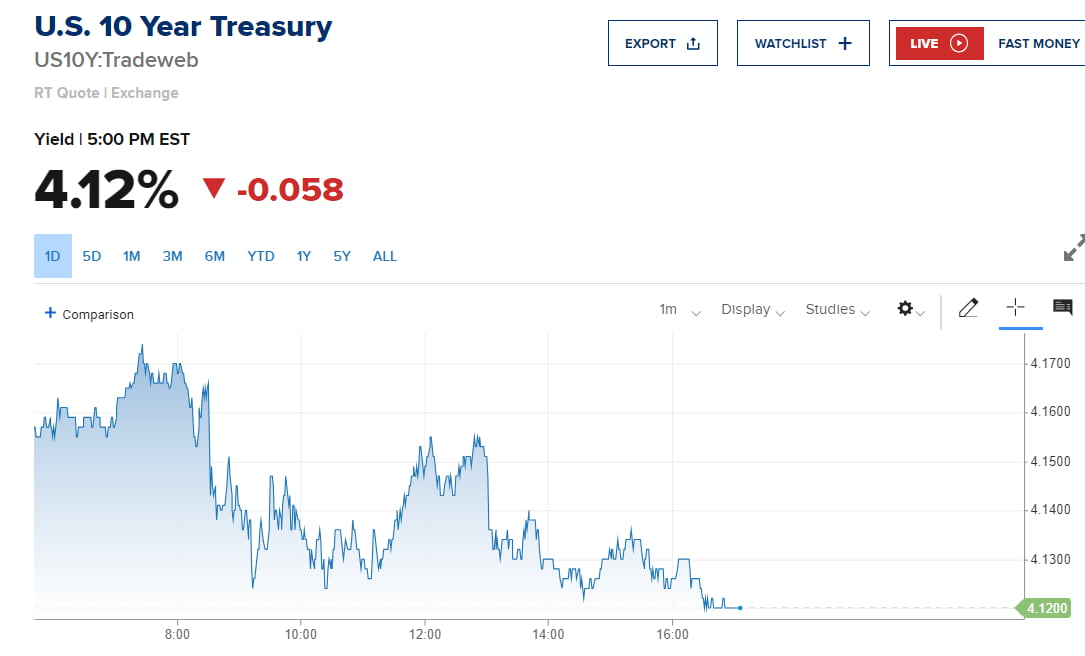 뉴욕 채권 시장에서 국채 금리는 GDP 발표 직후 순간 큰 폭으로 뛰었다가(뜨거운 GDP) 금세 뚝 떨어졌습니다(낮은 물가). 국채 금리는 오후 1시 추가 하락했습니다. 410억 달러 규모의 7년물 국채 입찰 결과가 괜찮았기 때문입니다. 응찰률은 2.574배로 작년 10월 이후 가장 높았고, 발행 금리는 4.109%로 발행 당시 시장 금리 4.106%보다 0.3bp 높게 결정됐습니다. 높긴 했지만 아주 높진 않습니다. 게다가 해외 수요를 나타내는 간접수요가 69.1%까지 높아져 프라이머리 딜러가 인수한 양은 13.94%에 그쳤습니다.