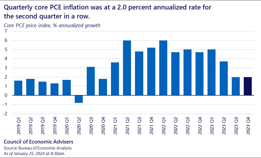 놀라운 건 이렇게 높은 성장 속에서도 인플레이션은 안정됐다는 것이죠. 4분기 개인소비지출(PCE) 물가는 1.7% 상승하는 데 그쳐 3분기 2.6%보다 크게 둔화했고요. 미 중앙은행(Fed)이 물가 벤치마크로 삼고 있는 근원 PCE 물가는 4분기 2% 증가해 3분기(2%)와 같았습니다. 2개 분기 연속으로 물가 목표를 달성했다는 뜻입니다. 월가는 이를 바탕으로 내일 발표될 12월 PCE 물가는 전월 대비 0.17% 미만 상승했을 것으로 추산했습니다.