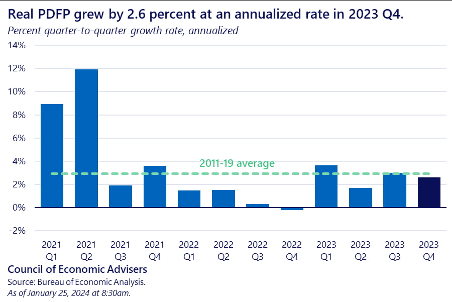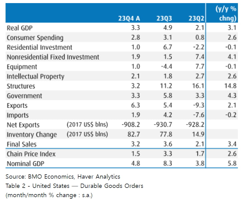JP모건의 마이크 페롤리 수석 이코노미스트는 "재고가 예상보다 증가한 게 크지만 그런 세부 사항을 따지지 않아도 매우 좋은 성장이었다. 이런 성장 모멘텀 속에 2024년을 시작했지만 우리는 여전히 올해 경기 둔화를 예상한다. 4분기 재고 증가로 인해 이번 분기 생산을 늘릴 필요성은 줄어든다. 의회 분열로 정부 지출도 계속 둔화할 것이다. 우리는 여전히 6월 금리 인하를 전망한다. Fed가 3월에 내리려 한다면 다음주 FOMC에서 신호를 보내야 한다. 그런데 지난주까지 Fed 멤버들에게 들은 얘기는 '인플레이션이 2%로 돌아간다는 데 아직 자신감이 부족하다'라는 것이었다. 강한 고용 상황도 3월 인하를 하기엔 조금 성급하다. 3월 인하는 그때까지 노동시장이 크게 악화하여 실업률이 4% 이상으로 올라야 가능할 것"이라고 말했습니다.