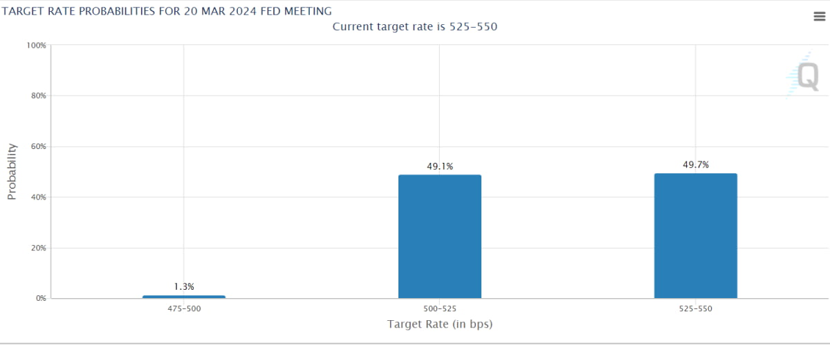 시카고 상품거래소의 Fed 워치 시장에서는 3월 금리 인하 기대를 50%가량 반영했습니다. 이는 전날 41.2%보다 약간 높아진 것입니다.