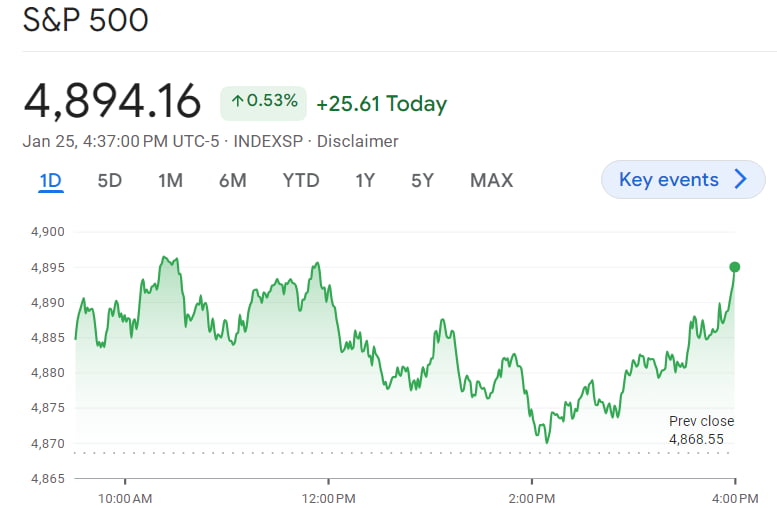 S&P500 지수가 25일(미 동부시간) 닷새째 사상 최고 행진을 이어갔습니다. 미국의 4분기 GDP는 예상보다 훨씬 좋았고, 그런데도 인플레이션은 2%에 머무른 것으로 나타났습니다. 이런 만화 같은 데이터에 시장은 흥분했습니다. 테슬라가 12% 이상 폭락한 게 흠이었습니다.