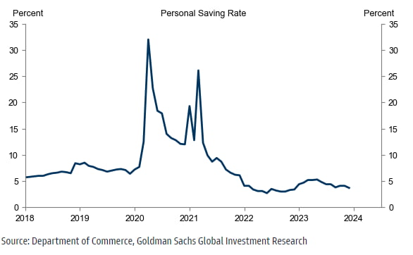 이유는 간단합니다. PCE 보고서를 보면 12월 개인소득은 한 달 만에 0.3% 증가(예상 0.3%)했고요. 개인소비지출은 0.7%(0.4%) 늘었습니다. 소비가 예상보다 훨씬 뜨거웠던 것이죠. 게다가 11월 소비지출도 기존 0.2%에서 0.4% 증가로 상향 조정됐습니다. 어제 4분기 GDP 발표에서 본 것처럼 활발한 소비가 이어지고 있는 것입니다. 고용이 강한데다, 인플레이션이 둔화하며 실질 소득이 늘고 있기 때문일 것입니다. 물론 소득 증가율보다 더 많은 소비는 지속하기 어렵습니다. 신용카드 빚이 늘어나고 저축이 감소할 수밖에 없죠. 12월 저축률은 다시 11월보다 0.4%포인트 떨어진 3.7%로 내려왔습니다.