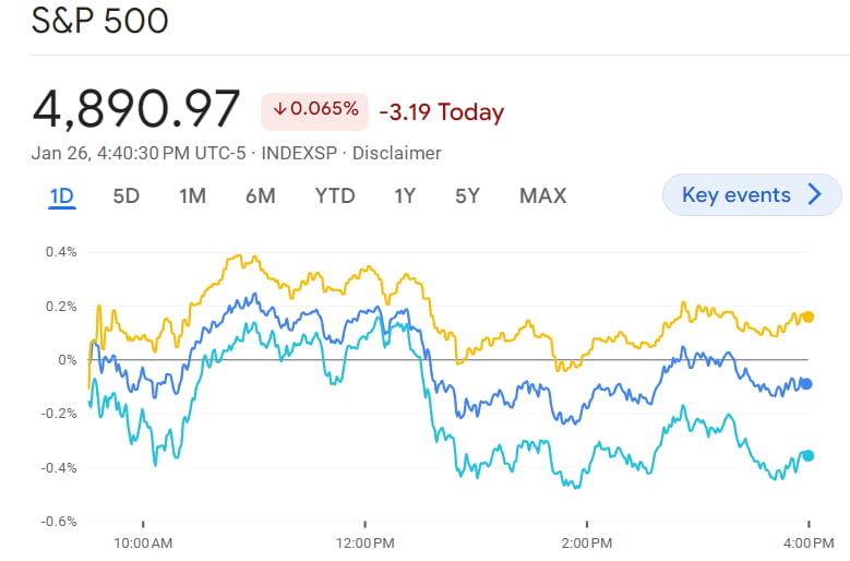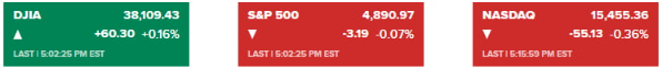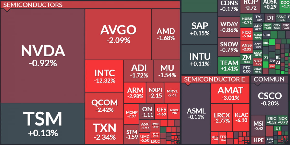 나스닥이 상대적으로 약했던 이유는 인텔 탓입니다. 전날 실망스러운 1분기 실적 전망을 공개한 인텔이 11.91% 폭락하면서 반도체 업종 하락세를 이끌었습니다. 어제 반도체 장비업체인 KLA도 예상에 약간 못 미치는 가이던스를 내놓았죠. 이에 따라 AMD(-1.71%), 엔비디아(-0.95%), 마이크론(-1.29%) 등이 모두 하락했습니다. 인공지능(AI) 수혜 기대가 반도체 업종을 끌어 올리고는 있지만, 인텔과 텍사스 인스트루먼츠, SK하이닉스, ST마이크로 등의 부정적 실적 혹은 가이던스는 투자자들에게 약간 불안감을 주고 있습니다.