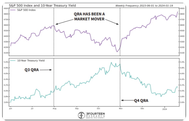 다음주 국채 시장에는 FOMC만큼이나 중요한 이벤트가 있습니다. FOMC 결과가 나오는 31일 오후 미 재무부는 분기국채발행계획(QRA)을 공개합니다. 작년 7월 말 '장기 국채 발행 증가'를 예고한 3분기 QRA가 나온 뒤 10년물 금리가 급등했고, 이에 재무부는 10월 말 '장기물보다 단기물을 늘린' 4분기 QRA를 발표해 금리 안정세를 유도했습니다.