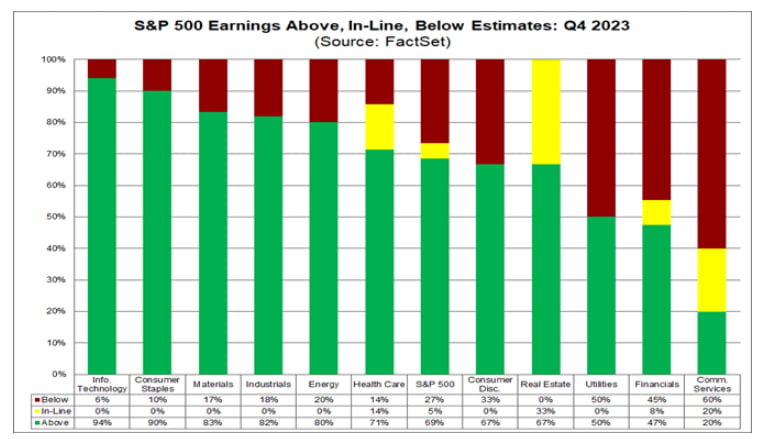 현재까지 4분기 어닝시즌은 수준 이하입니다. 팩트셋에 따르면 이번 주까지 S&P500 기업 중 25%가 실적을 보고했는데 이들 중 69%만 추정치보다 높은 주당순이익(EPS)을 내놓았습니다. 이는 5년 평균 77%, 10년 평균 74%보다 낮습니다. 전체적으로 기업들은 월가 추정치보다 5.3% 낮은 이익을 보고하고 있습니다. 이것도 5년 평균(+8.5%), 10년 평균(+6.7%)보다 나쁩니다. 팩트셋은 보고한 기업과 아직 보고하지 않은 기업의 추정치를 합산하면 4분기 어닝시즌 이익은 전년 동기보다 1.4% 감소할 것으로 추정했습니다. 지난 주말의 -1.8%보다는 개선됐지만, 작년 말 추정치 1.5% 증가보다는 못합니다. 물론 이는 지역은행 등 금융사들이 나쁜 실적을 내놓은 탓이 큽니다.