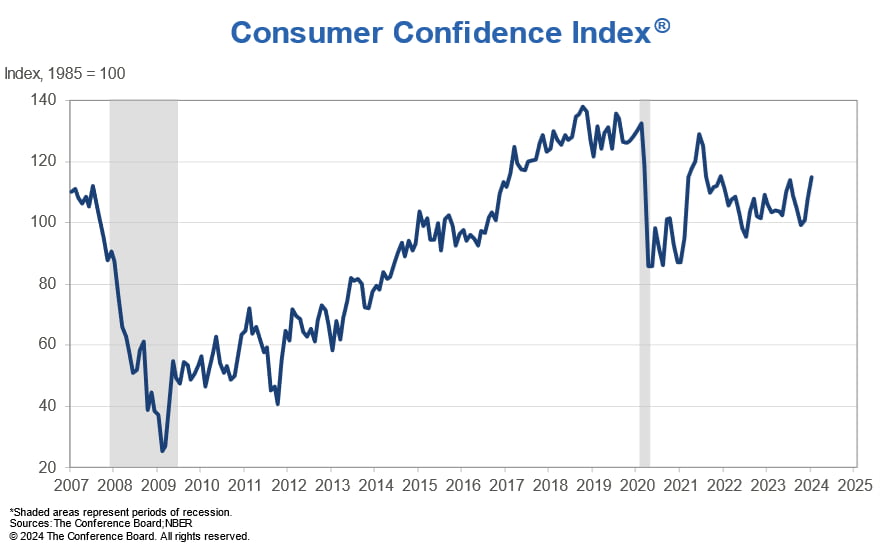 판테온 이코노믹스는 "소비자신뢰지수가 6.8포인트 상승하면서 2021년 12월 이후 최고 수준으로 뛰어올랐다. S&P500 지수의 지속적 랠리와 휘발유 가격 하락은 많은 이유를 설명한다. 이런 추세는 급격한 인플레이션 하락과 모기지 금리 하락으로 인해 촉진되고 있는 것으로 추정한다"라고 설명했습니다.