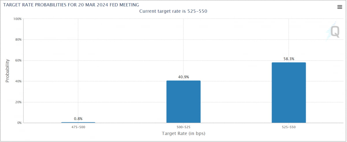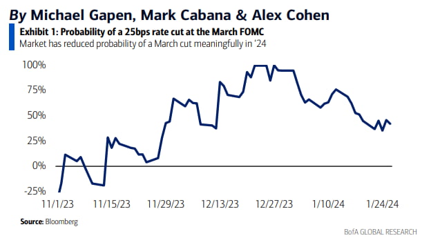 이러다 보니 시장의 3월 인하 베팅도 감소하고 있습니다. 시카고상품거래소의 Fed워치 시장에서 3월까지 금리 인하 가능성은 41% 수준으로 떨어졌습니다. 불과 한 달 전만 해도 90%에 가까웠습니다.