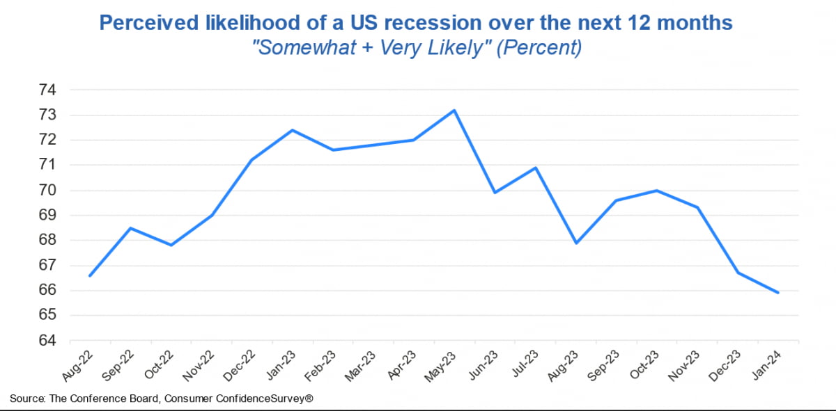 소비자의 1년 단기 인플레이션 기대도 5.2%로 낮아졌습니다. 2020년 3월 이후 가장 낮은 수준입니다. 소비자가 인식한 향후 12개월 동안 미국 경기 침체 가능성은 1월에도 계속해서 감소했습니다. 콘퍼런스보드의 다나 피터슨 이코노미스트는 "소비자 신뢰 상승은 인플레이션 둔화, 향후 금리 인하에 대한 기대, 기업 고용 지속에 따라 전반적으로 양호한 고용 환경을 반영한 것 같다"라고 분석했습니다.