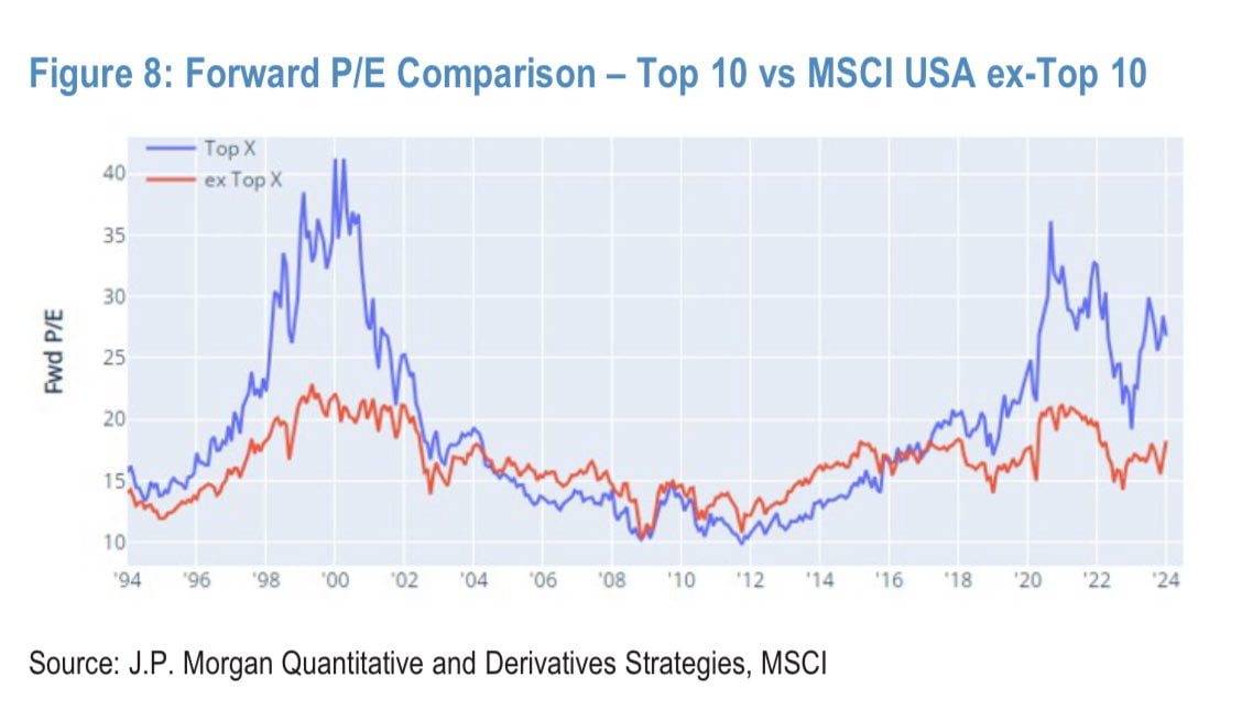 JP모건은 오늘 현재 랠리와 2000년 닷컴 버블 사이에 수많은 유사점이 있다는 보고서를 냈습니다. 매그니피센트 7을 포함하는 상위 10개 주식이 시가총액의 29.3%를 차지하고 있는데 이는 2000년 6월의 역사적 최고치인 33.2%에 가깝다는 것입니다. 또 상위 10개 종목에 4개 업종만 포함되어 과거 평균 6개 업종에 비하면 상승세가 일부에만 집중됐다고 지적했습니다. 이런 높은 밸류에이션과 집중도는 지수가 한계에 가까워지고 있음을 나타낼 수 있으며 시장 조정은 자연스러울 것이라고 주장했습니다.