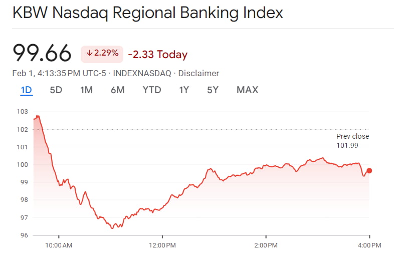 오후 장 들어 지역은행 주가는 어느 정도 회복했습니다. 뉴욕커뮤니티은행의 주가는 11.13% 내림세로 거래를 마쳤습니다. KBW 지역은행 지수는 2.29% 하락했습니다.