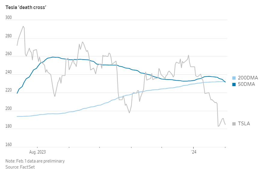 테슬라는 0.8% 올랐습니다. 하지만 기술적으로는 2022년 5월 이후 처음으로 '데스 크로스'(death cross)가 발생했습니다. 50일 이동평균선이 200일 이동평균선을 하향 돌파하는 것으로 주가가 추가 하락할 수 있음을 의미합니다.