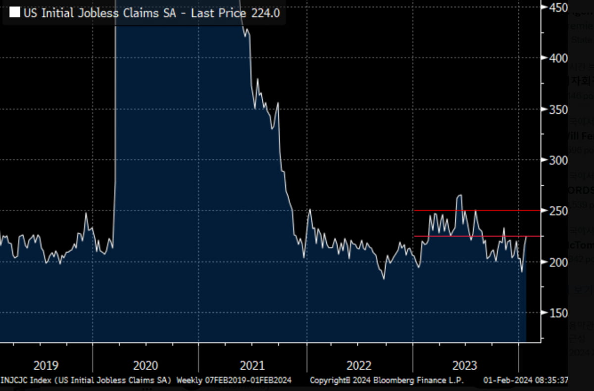 EY의 그레고리 다코 이코노미스트는 "실업급여 청구 건수가 지난 몇 주 동안 이어진 2022년 9월 이후 최저 수준에서 반등했다. 지난 몇 주 연휴 기간의 소음이 많은 데이터가 사라진 효과로 보인다. 추세를 알려면 앞으로 2주 정도 이 데이터를 자세히 보는 게 중요하다"라고 말했습니다. 리처드 번스타인 어드바이저스는 "청구 건수가 작년 초 22만5000~25만 건 수준으로 다시 올라갔다. 지금부터 잘 지켜볼 필요가 있다. 25만 개 이상으로 높아지는 건 좋지 않은 신호가 될 것"이라고 전망했습니다.
