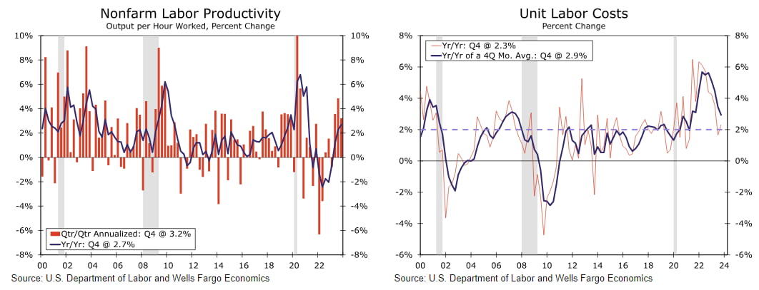 노동비용 증가가 둔화하고 생산성이 높아진다면 Fed가 인플레이션을 잡기가 쉬워집니다. 웰스파고는 "명목 보상 비용의 증가세가 둔화하고 생산성이 향상되면서 노동 시장에서 발생하는 인플레이션 압력이 급격히 감소했다. 생산성을 고려한 노동비용인 단위 노동비용은 지난 1년 동안 2.3% 상승했다. 이는 4분기 고용비용지수(ECI)에 이어 인건비 증가율이 Fed의 물가 목표 2%에 가까워지고 있음을 보여주는 또 다른 데이터"라고 설명했습니다.