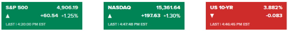 1일(미 동부시간) 뉴욕 증시는 오전과 오후 장이 확연히 달랐습니다. 오전까지는 어제 연방공개시장위원회(FOMC) 휴유증과 이어진 지역은행 불안감 등이 분위기를 주도했습니다. 금리는 급락했고 주가는 반등했지만, 전날 내림세에 비하면 크진 않았습니다. 하지만 오후 들어 투자자들은 다시 자신감을 찾았습니다. 실저 발표를 앞둔 애플, 아마존, 메타에 대한 기대가 점점 커진데다 이스라엘-하마스 휴전이 진전되고 있다는 소식이 나왔습니다. 그리고 장 마감 뒤 애플과 아마존, 메타는 월가 추정을 넘는 실적을 발표했습니다.