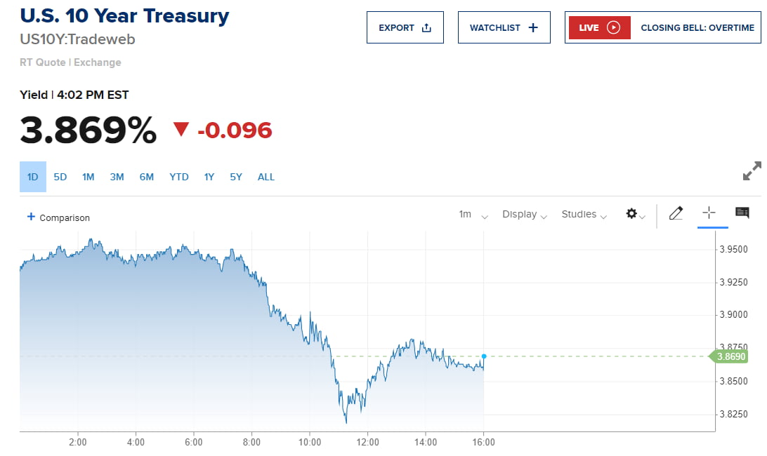 큰 폭 하락세를 보이던 채권 금리도 안전자산 선호 현상이 덜해지면서 약간 회복했습니다. 오후 4시께 미 국채 2년물 수익률 3.3bp 내린 4.202%, 10년물은 9.6bp 떨어진 3.869%에 거래됐습니다. 10년물은 오늘 아침 한때 3.817%까지 급락하기도 했습니다.