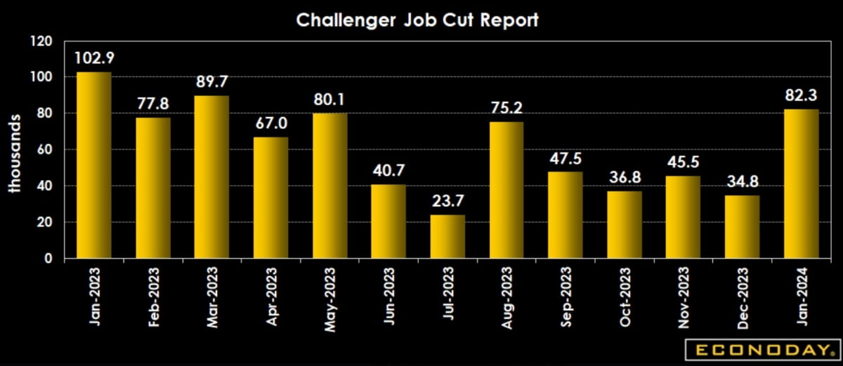 챌린저, 그레이 앤드 크리스마스(CG&C)가 집계한 1월 기업 감원 계획은 8만2307명으로 전월 대비 136% 증가했습니다. 이는 작년 같은 기간보다 20% 적은 수준이긴 한데, 작년 1월을 제외한다면 1월 감원 계획으로는 글로벌 금융위기 직후인 2009년 1월 이후 가장 많았습니다. 또 1월 고용 계획은 5376명으로 1월 역대 최저를 기록했습니다.