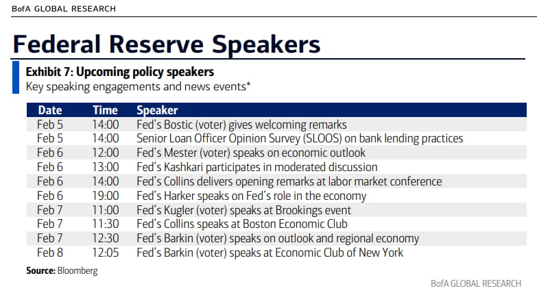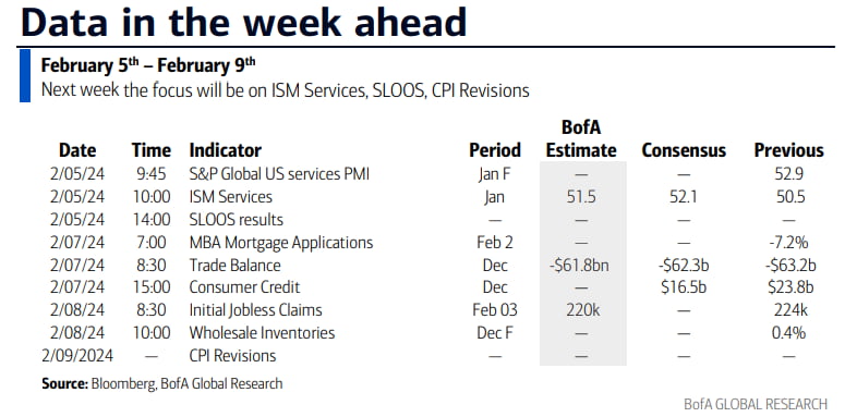 월요일에 나오는 ISM 서비스 PMI가 중요합니다. 지수는 12월에 50.5로 전월보다 2포인트 하락해 2023년 최저 수준으로 떨어졌습니다. 하락 원인은 고용 요소가 7.4포인트 급락해 43.3으로 하락한 탓입니다. 예상(51.0)이나 11월(50.7)보다 훨씬 낮았죠. 1월 고용보고서가 잘못되었느니 여러 가지 논란이 있는 상황에서 서비스 고용이 낮은 수준을 유지할 경우 시장에서 3월 인하 희망이 다시 강해질 수 있습니다. 월가는 헤드라인 ISM 서비스 지수는 52.0으로 서비스 부문의 지속적 강세를 입증할 것으로 예상합니다.