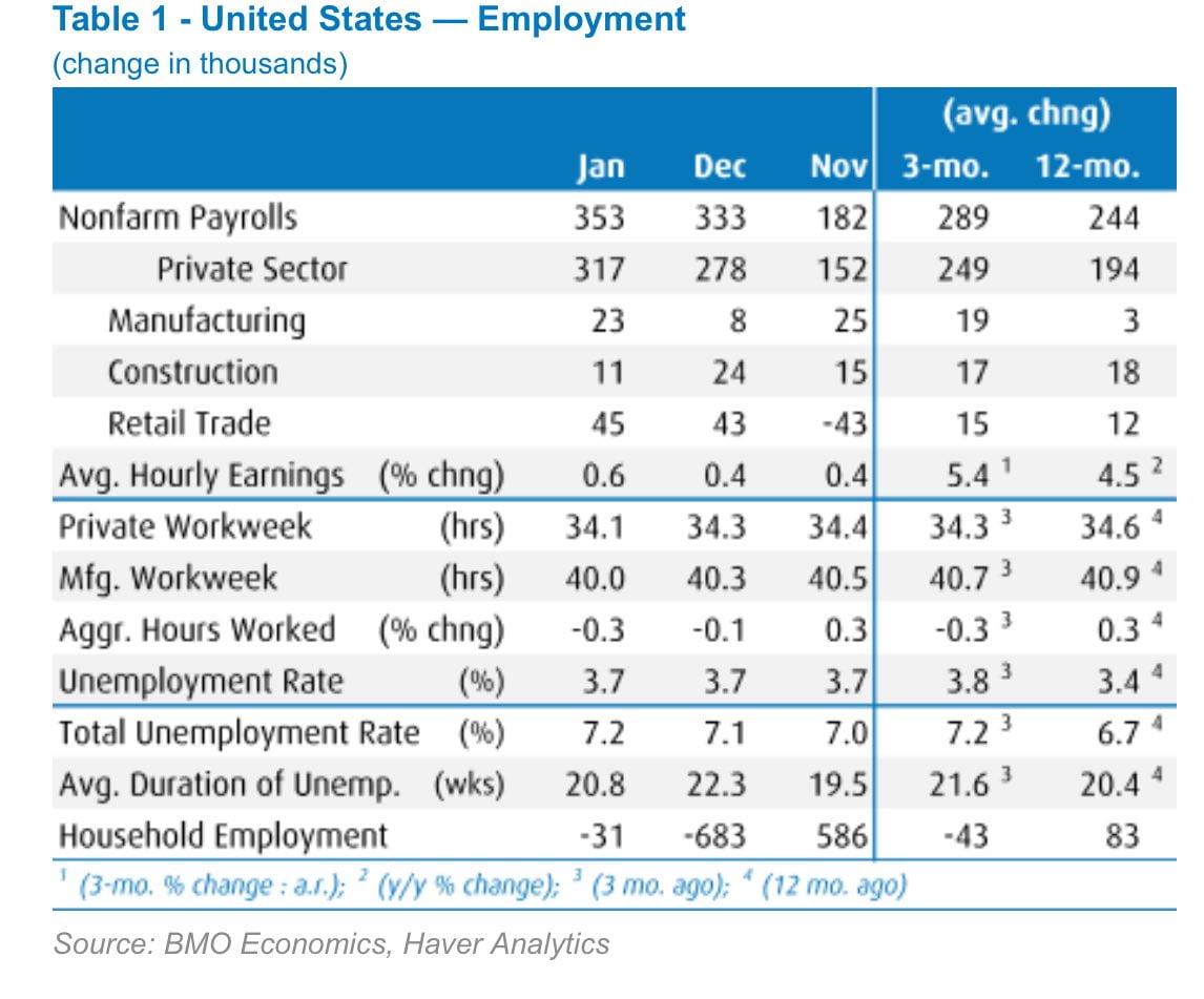이번 주 발표된 실업급여 청구 건수, ADP 1월 민간고용, 4분기 고용비용지수(ECI), 미 공급관리협회(ISM)의 1월 제조업 구매관리자지수(PMI)에서의 고용 등은 모두 노동시장이 조금씩 둔화하고 있음을 보여줬습니다. 하지만 1월 고용보고서는 완전히 달렸죠. 블랙록의 릭 리더 채권 최고투자책임자는 "1월 신규고용 35만3000개 증가, 구인이직보고서(JOLTS)의 채용공고 증가, 임금 상승률 등을 보면 노동시장이 (내년에는 둔화할 가능성이 있지만) 조만간 문제에 봉착할 가능성이 없다는 점을 시사한다"라고 밝혔습니다.