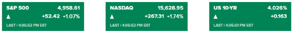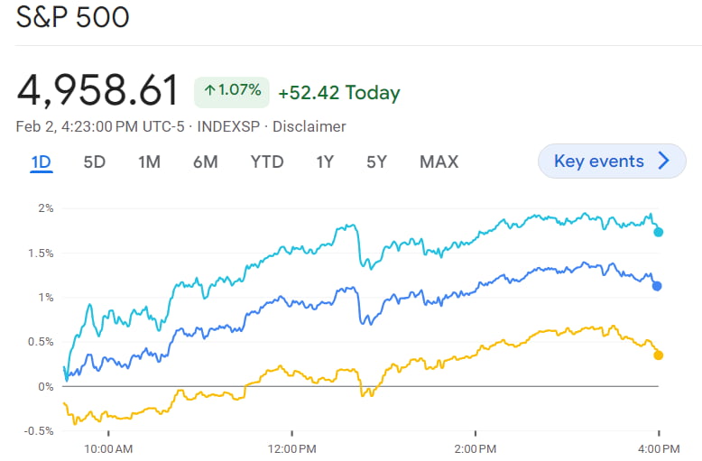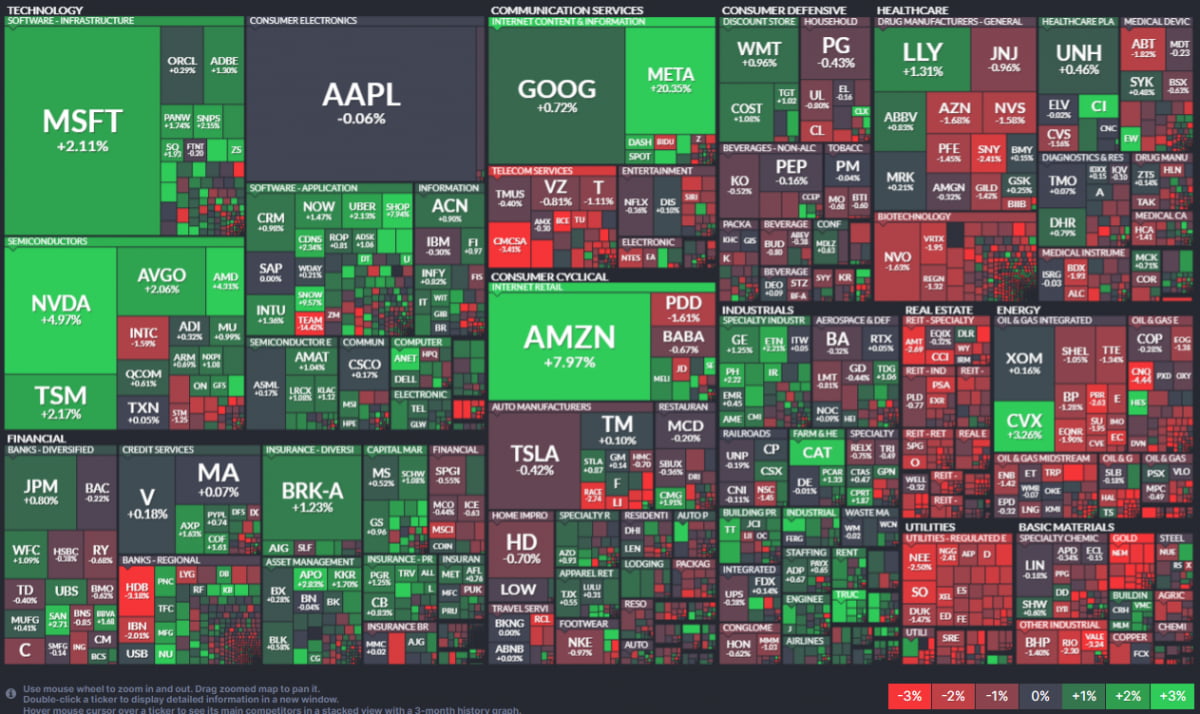 메타가 20.35% 뛰었고 아마존은 7.97% 상승했습니다. 메타의 경우 2022년 11월 주당 88달러까지 떨어졌었는데, 오늘 하루 주가 상승 폭만 80달러를 넘었습니다. 마이크로소프트는 2.11% 올랐고, 엔비디아는 4.97% 뛰었습니다. 하지만 알파벳은 0.72% 오르는 데 그쳤고요. 애플은 0.06% 약보합세로 마감했고 테슬라는 0.42% 내렸습니다. 애플은 한때 4% 넘게 내리기도 했습니다.