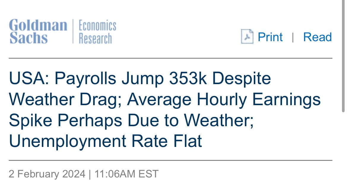 또 고용과 임금이 대폭 증가할 정도로 노동 수요가 많은데, 근무 시간은 주당 34.1 시간까지 줄었다는 것도 이상합니다. 이는 과거 불황 수준이기 때문입니다. 블랙록의 리더 CIO는 "소득 증가는 이 보고서에서 암시하는 것만큼 강력하지 않을 것"이라며 "시간당 평균 임금 상승률은 분모에 의해 잘못된 것으로 보이며, 1월 기상악화로 인해 근로시간이 약화하였을 가능성이 있다"라고 설명했습니다. 악천후로 인해 보고된 평균 근무 시간이 줄어들었고 결과적으로 계산상 시간당 소득이 늘어났을 것이라는 겁니다. 실제 보고서를 보면 악천후로 출근하지 못한 사람이 58만 명에 달한 것으로 나타납니다. 골드만삭스는 "시간당 임금은 나쁜 날씨로 인해 급등할 수 있다"라면서 여전히 오는 5월에 Fed가 처음으로 금리를 인하할 것이라고 주장했습니다.