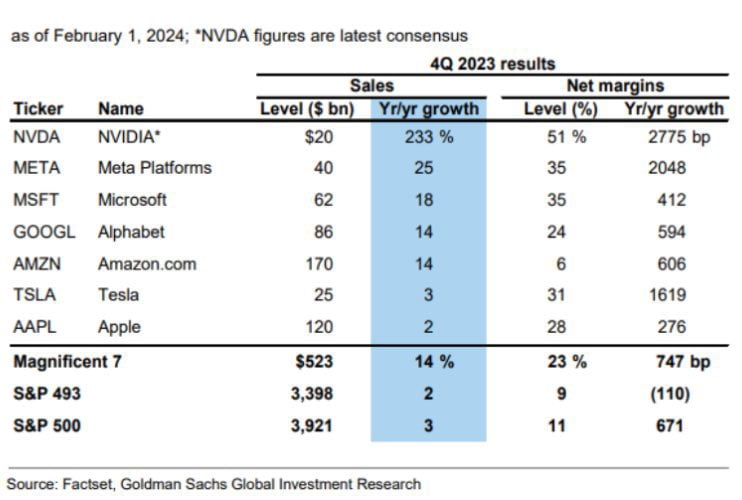 사실 어닝시즌 초기는 실망스러웠습니다. 은행, 특히 지역은행 실적이 예상이 미치지 못했지요. 그러나 빅테크가 나서면서 분위기가 달라졌습니다. 기술주로 이뤄진 커뮤니케이션 업종은 4분기 매출이 9.5%, 이익은 42.4% 증가할 것으로 추정됐고, IT 업종은 각각 4.0%, 12.8% 늘어날 것으로 관측되고 있습니다. 오는 21일 엔비디아가 '어닝 서프라이즈'를 발표하면 추정치는 더 높아질 것입니다. 월가 기대는 매우 큽니다. 골드만삭스가 엔비디아의 목표주가를 800달러로 높인 데 이어 모건스탠리도 오늘 목표주가는 603달러에서 750달러로 상향 조정했습니다. 조셉 무어 애널리스트는 “AI 수요는 계속 급증하고 있다. 지금 엔비디아 주식은 주가수익비율(P/E)의 25배 이하로 거래되기 시작했는데, 지난 몇 년 동안 몇 번밖에 볼 수 없었던 수준"이라고 주장했습니다. 골드만삭스는 엔비디아가 추정에 부합하는 4분기 실적을 내놓으면 '매그니피선트 7'(magnificent 7) 주식은 4분기 매출 증가율 14%, 총마진 23%로 나머지 S&P493개 종목의 2%, 9%에 비해 월등히 나은 성적을 내놓게 된다고 밝혔습니다. 마진으로만 보면 M7은 전년 동기보다 7.47%포인트 증가하지만, 나머지 종목은 1.1%포인트 감소합니다.