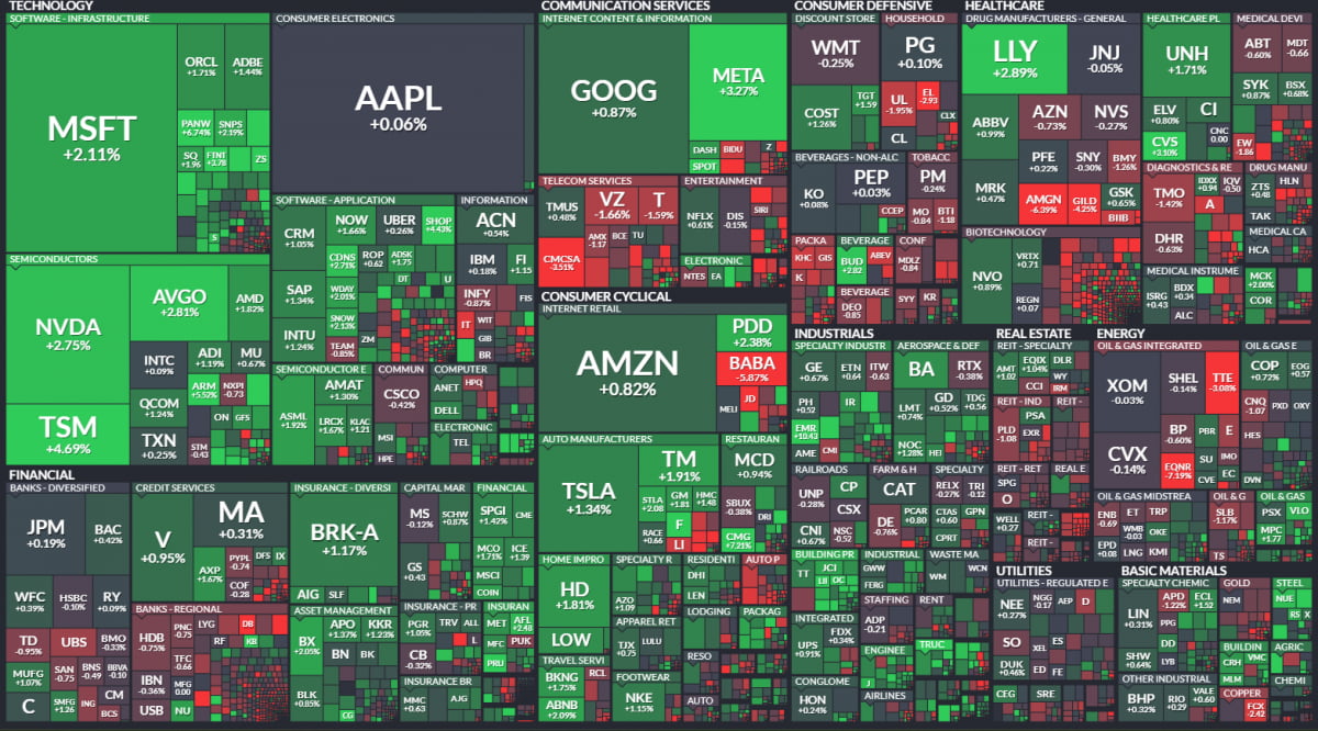 비관론자들은 Fed가 금리 인하를 늦추면 올해 경기가 둔화하면서 기업들의 매출이 정체되고 마진이 축소될 수 있다고 주장합니다. 이에 대해 뱅크오브아메리카의 사비타 서브라매니언 전략가는 "수요 회복 없이도 마진이 잘 버티고 있으며, 수요가 회복되기 시작한다면 마진이 더욱 개선될 것"이라고 반박했습니다. 홍해 사태 및 파나마운하 가뭄으로 인한 물류비 상승에 대해서도 "S&P500 기업의 전체 물류비용은 총운영비용의 2%에 불과하다"라고 지적했습니다. 투자자들이 M7 주식의 지속적 성장과 인공 지능(AI) 순풍에 베팅하면서 오늘도 이들이 시장 상승세를 이끌었습니다. 엔비디아는 2.75% 올랐고 마이크로소프트는 2.11%, 메타는 3.27%, 아마존 0.82%, 알파벳 0.87% 상승했습니다. 테슬라도 오늘은 1.34% 올랐고요. 새로운 M7 주식으로 거론되는 일라이 릴리는 2.89% 뛰었습니다.