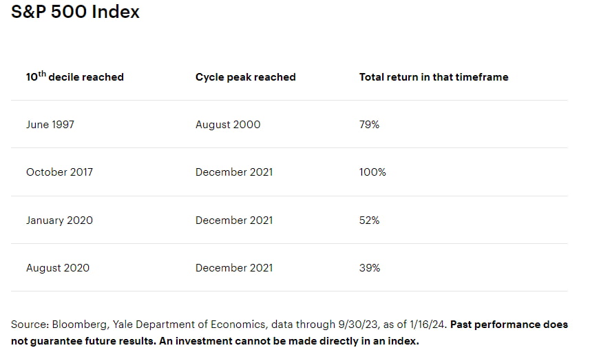일부에서는 지속적 주가 상승으로 밸류에이션이 너무 비싸졌다고 지적합니다. 이에 대해 인베스코는 "과거를 보면 밸류에이션은 투자자들이 믿을 수 있는 투자 적기를 잡는 지표는 아니었다"라면서 "현재 S&P500 지수가 과거에 비해 비싼 것은 사실이지만, 높은 밸류에이션만으로는 주식을 줄일 이유가 되지 못한다"라고 지적했습니다. 인베스코가 1997년부터 S&P500 지수의 밸류에이션이 십 분위로 따져 10분위, 즉 가장 비싼 구간에 도달했을 때를 찾아내 추적했는데요. 이후 사이클 고점까지 39%에서 100%까지 추가 상승한 것으로 나타났습니다.