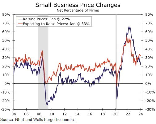 웰스파고는 "약한 중소기업 낙관론은 1월 소비자 신뢰가 눈에 띄게 증가한 것과 상충된다. 이런 차이는 기업이 여전히 높은 투입 비용으로 인해 어렵지만, 소비자에게 전가하기 어려운 상황을 나타낼 수 있다"라고 분석했습니다. 실제 지난 3개월 동안 긍정적 이익을 거뒀다는 중소기업은 12월 -25%에서 1월 -30%로 줄었고요. 판매가를 인상했다는 답변도 25%에서 22%로 감소해 3년 내 최저치를 기록했습니다. 하지만 앞으로 가격 인상을 예상하는 기업 비율은 33%로 증가해 2023년 11월 이후 가장 많아졌습니다. 가격을 올리려는 기업이 늘고 있다는 건 오늘 CPI 보고서처럼 인플레이션 압력이 완전히 소멸하지 않았음을 드러냅니다. 미국공급관리협회(ISM)가 발표한 1월 서비스업 구매관리자지수(PMI)에서도 지불가격이 12월 56.7에서 1월 64로 치솟은 것으로 집계됐지요.