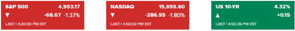 뉴욕 증시의 주요 지수는 0.3~2%에 달하는 급락세로 거래를 시작했습니다. 내림세는 시간이 갈수록 거세졌습니다. 결국, 다우는 1.35%, S&P500 지수는 1.37% 내렸고 나스닥은 1.80% 떨어졌습니다. UBS의 브라이언 로즈 이코노미스트는 "CPI 데이터는 S&P500 지수를 5000 이상으로 끌어올리는 데 도움이 되었던 일련의 인플레이션 데이터와 골디락스 시나리오를 혼란에 빠뜨렸다"라고 말했습니다. 인디펜던트 어드바이저의 크리스 자카렐리 전략가는 "인플레이션이 여전히 문제라면 채권은 너무 비싸다. 금리가 장기적으로 높아진다면 증시는 계속 상승세를 유지할 수 없다. 특히 Fed가 금리 인상을 완전히 마쳤다는 가정이 잘못된 경우에는 더욱 그렇다"라고 설명했습니다.