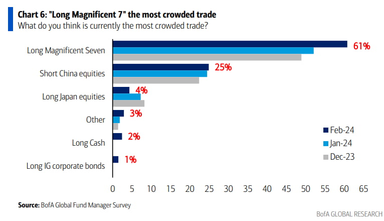 펀드매니저들은 가장 붐비는 거래로 매그니피센트 7(61%), 중국 주식 매도(25%), 일본 주식 매수(4%), 현금 매수(2%) 및 투자 등급 회사채 매수(1%) 등을 꼽았습니다.