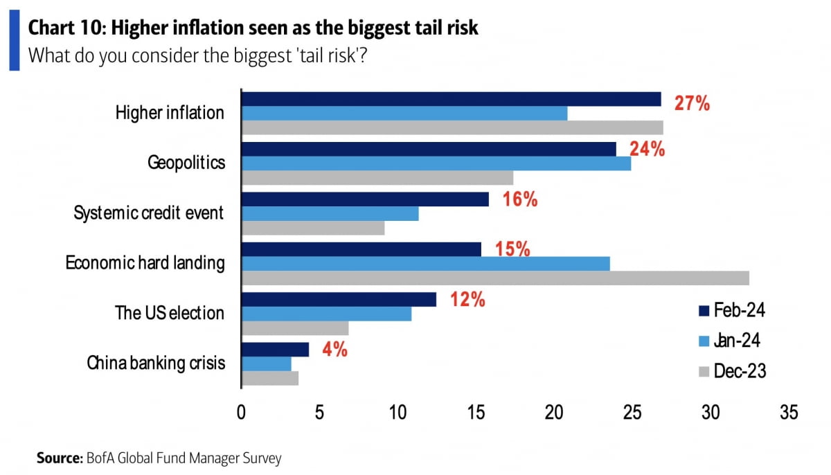 이들은 가장 큰 꼬리 위험으로는 높은 인플레이션, 지정학, 시스템적 신용 사건, 경제 경착륙, 미국 선거 및 중국 은행 위기 등을 꼽았습니다.