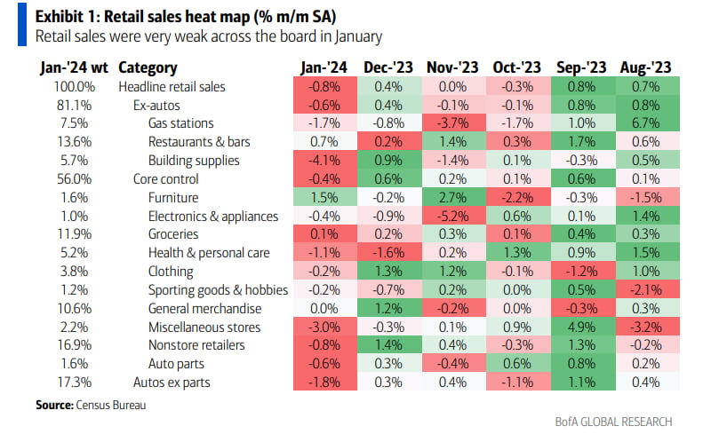 뱅크오브아메리카는 "1월의 추운 날씨, 계절적 요인으로 인해 1월 소매판매가 부진했던 것 같다. 약세는 광범위하게 나타났고, 12월 하향 수정은 큰 이야기다. 이는 '미국 경제 과열' 내러티브에 반대되는 데이터"라고 분석했습니다.