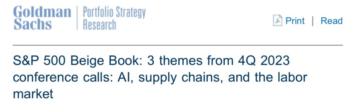 골드만삭스는 AI가 여전히 이번 어닝시즌의 중심이라고 분석했습니다. 그러면서 ▲AI가 생산성 향상, 비용 절감, 제품 출시를 개선하는 기업(MSFT, BK, UNH, AMZN, IBM) ▲AI 관련 제품과 서비스에 대한 수요를 보기 시작한 기업(AMD, NOW, GOOGL, FCX, FFIV) ▲AI에 대한 추가 투자 필요성에 대해 말하는 기업(GM, META, ADP, BEN, RHI) 등이 있다고 밝혔습니다.