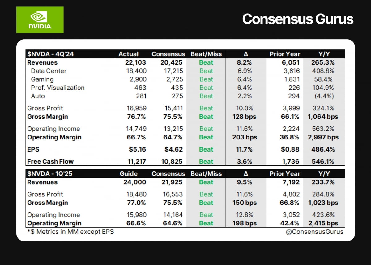 그리고 오후 4시 20분 엔비디아의 4분기 실적이 발표됐습니다. 발표된 수치들은 예상을 훌쩍 뛰어넘었습니다.