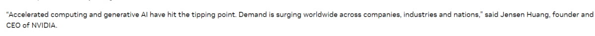 엔비디아가 밝힌 것 중 두 가지가 투자자 눈에 띄었습니다. 젠슨 황 CEO가 "가속 컴퓨팅과 생성 AI는 이제 티핑포인트(Tipping point, 전환점)에 도달했다. 기업과 산업, 국가 전반에 걸쳐 전 세계적으로 수요가 급등하고 있다"라고 밝힌 것입니다. 티핑포인트를 넘어가면 수요는 기하급수적으로 늘어날 수 있지요.
