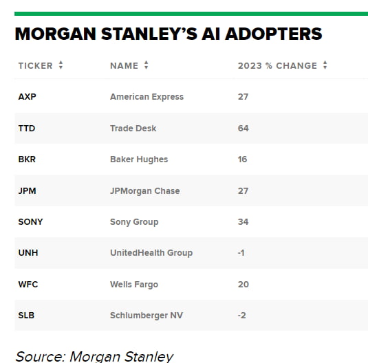 그러나 이는 아직 증시에서는 본격적으로 주목받고 있지는 못하다는 게 모건스탠리의 판단입니다. 모건스탠리는 "올해 들어 엔비디아 마이크로소프트 알파벳 등 세 개의 인에이블러 주식이 S&P500 지수 성과의 절반을 차지하는 등 여전히 각광받고 있지만 어답터 주식은 계속해서 그보다 저조한 성과를 보이고 있다"라고 지적했습니다. 모건스탠리가 추천하는 AI 어답터 기업은 △아메리칸 익스프레스(AXP) △트레이드 데스크(TTD) △베이커휴즈(BKR) △JP모건(JPM) △소니그룹(SONY) △유나이티드헬스(UNH) △웰스파고(WFC) △슐럼버제이(SLB) 등입니다. 이들은 금융, 에너지, 헬스케어, 엔터테인먼트 등 다양한 산업에서 선구적으로 AI에 투자하고 있는 기업들입니다.