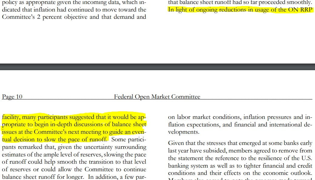 다행인 건 양적 긴축(QT)과 관련해선 진전된 언급이 나왔다는 것이죠. 회의록은 "참석자들은 대차대조표 감축이 원활하게 진행되고 있으며, ON RRP(역레포) 사용량이 지속해서 감소하고 있는 상황에서 감축 속도를 늦추는 시점에 대해 심도 있는 논의를 시작하는 게 적절할 것이라고 언급했다"라고 적었습니다. 3월 다음 회의에서 논의하겠다는 뜻입니다. 또 "일부 참석자들은 감축 속도를 늦추면 더 오랫동안 대차대조표 감축을 계속할 수 있게 할 수 있다고 언급했다"라고 덧붙였습니다.