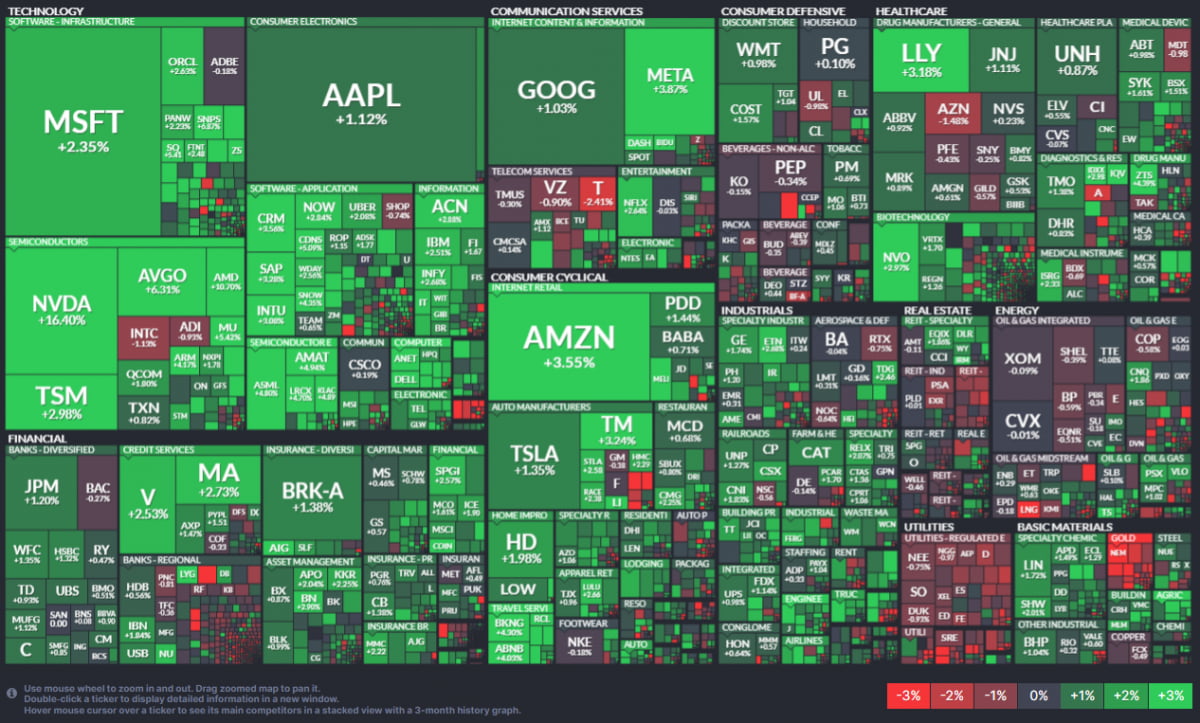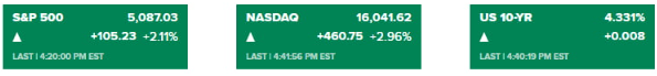 오늘 증시는 엔비디아가 지배했습니다. 결국, 다우는 1.18%, S&P500 지수는 2.11%나 급등했고 나스닥은 2.96% 치솟은 채 거래를 마쳤습니다. 세 지수 모두 사상 최고치를 기록했고, 다우는 사상 처음 3만9000선을 돌파했습니다.