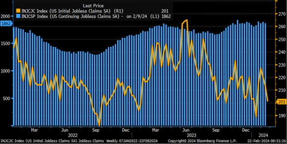 즉 막대한 투자, 주가 상승 등으로 인해 경제가 개선되고 Fed는 성장 가속화로 인해 금리 인하를 늦추게 될 수 있다는 얘기입니다. 그렇지 않아도 어제 공개된 1월 연방공개시장위원회(FOMC) 회의록은 매파적이었습니다. "대부분(most) 회의 참가자들은 기준금리 인하에 있어 '너무 빨리 움직일' 위험(Risks Of Easing Too Quickly)에 대해 지적했다. 단지 몇 명(only a couple)만이 지나치게 제약적인 정책과 관련된 위험을 강조했다"라고 기술했죠. 유럽중앙은행(ECB)도 오늘 새벽 1월 통화정책회의 회의록을 공개했는데, Fed만큼이나 조심스러웠습니다. "너무 일찍 정책 금리를 인하하는 위험이 너무 늦게 인하하는 위험보다 더 큰 것으로 간주된다"라고 명시한 것이죠. ING는 "1월 회의록은 매우 조심스럽고 점진적인 변화를 시사한다. 첫 번째 금리 인하를 보려면 6월까지 기다려야 한다고 믿는다"라고 설명했습니다. 매파적 Fed로 인해 어제 금리가 상승했었습니다. 미 국채 10년물 수익률이 다시 4.3%를 넘었는데도 오늘도 전반적으로 상승세가 이어졌습니다. 아침부터 미국 경제가 여전히 강하다는 데이터가 줄줄이 나온 것도 수익률 상승을 지원했습니다. 지난 17일로 끝난 주간 신규 실업급여 청구 건수는 20만1000건으로, 직전 주보다 1만2000건 감소했습니다. 올해 들어 두 번째로 낮은 수치입니다. 예상 21만6000건도 밑돌았습니다. 2주 이상 연속으로 실업급여를 청구한 건수도 직전 주보다 2만7000건 줄어든 186만2000건으로 나타났습니다. RSM은 "올해 노동시장이 냉각될 것이라는 전망이 많지만, 경기 침체가 없다면 노동시장의 수급 불균형은 그렇게 빨리 완화되지 않을 수도 있다"라고 지적했습니다.