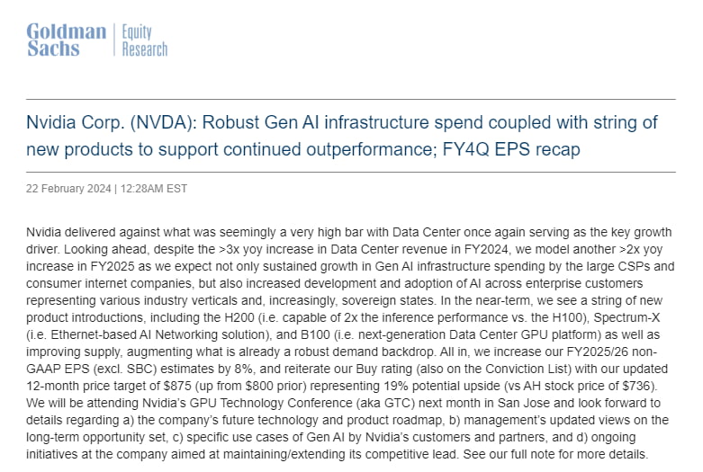 딥워터 매니지먼트의 진 먼스터 매니징 파트너는 "엔비디아 콘퍼런스콜에서 가장 듣고 싶었던 것은 장기 성장에 대한 예상이었다. 젠슨 황은 세상이 GPU 기반 AI로 전환되고 있고 모든 회사는 AI 회사가 될 것이며 엔비디아는 새로운 패러다임을 실현할 것이라고 말한 뒤 구체적 수치까지 제시했다. 젠슨 황은 '향후 5년 동안 데이터센터 구축이 두 배로 늘어나면서 1조 달러가 투자될 것으로 생각한다'라고 했는데 이는 현재 속도의 두 배에 달한다. 컴퓨팅 시장이 5년 뒤 3000억 달러 규모로 커지고 엔비디아의 점유율이 현재 약 80%에서 5년 후 60%로 낮아진다면 이는 2028회계연도 매출이 1800억 달러가 된다는 것을 의미한다. 이는 앞으로 매년 16% 복합성장을 의미하며 월가가 추정해온 것과 거의 동일하다. 향후 5년이 그런 식으로 비슷하게라도 발전한다면 엔비디아의 주가는 지금보다 높아져야 한다"라고 주장했습니다. 웨드부시의 댄 아이브스 애널리스트는 "AI 혁명은 이제 일어나고 있고, 젠슨 황과 엔비디아는 기술주 긍정론자들에게 지금이 '게임체인징' 순간이라는 걸 증명해냈다. 엔비디아의 어닝은 지난 5년간 통틀어 가장 중요한 것이었으며, 이는 기술주 강세장에 제트유를 주입할 것"이라고 말했습니다. 월가는 일제히 목표주가를 올렸습니다. JP모건은 650달러→850달러로 올렸고 뱅크오브아메리카는 800달러→925달러로, 골드만삭스는 800달러→875달러로 상향 조정했습니다. 1000달러 넘는 목표주가를 제시하는 곳도 있습니다. 번스타인이 700달러→1000달러로 높였고요, 키뱅크는 740달러→1100달러로 상향 조정했습니다.
